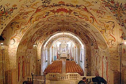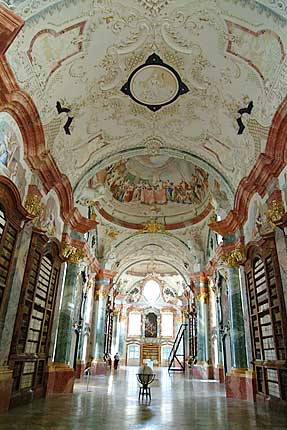 Da in den letzten Jahren vermehrt Teile (Gliedmaßen und Köpfe) der 106 Sandsteinfiguren bei heftigen Unwettern abgestürzt sind, wurde "Gefahr in Verzug" festgestellt und die morbiden Engel aus Zogelsdorfer Sandstein kurzerhand mit Schutzgerüsten unterstützt. Na so kann das natürlich nicht weitergehen, dass einem dort die Teile der Engel um die Ohren fliegen. Spenden werden unter "Engel für Engel für Engel" entgegengenommen. Sie können sogar einen Engel adoptieren, indem sie seine Renovierung bezahlen. Aber nun sei anlässlich des Jahres der Bibel, die sogenannte begehbare Bibel vorgestellt: An Hand des Fotos können sie die Ausmaße der begehbaren Bibel aus der Luft erkennen. Der ganze linke abstehende Teil des Klosters ist mit über 8.000 Büchern die schönste Bibliothek im Klösterreich und wird auch Tempel der Weisheit genannt. Dies habe ich aus dem für Kinder angelegten Rundgang mit Rätselfragen bei den einzelnen Stationen erfahren. Auch die Darstellung der Fresken des Tempels werden mit Bibelstellen belegt. Ein wirklich prunkvoller Anblick der Bedeutsamkeit, den man sich nicht entgehen lassen sollte.